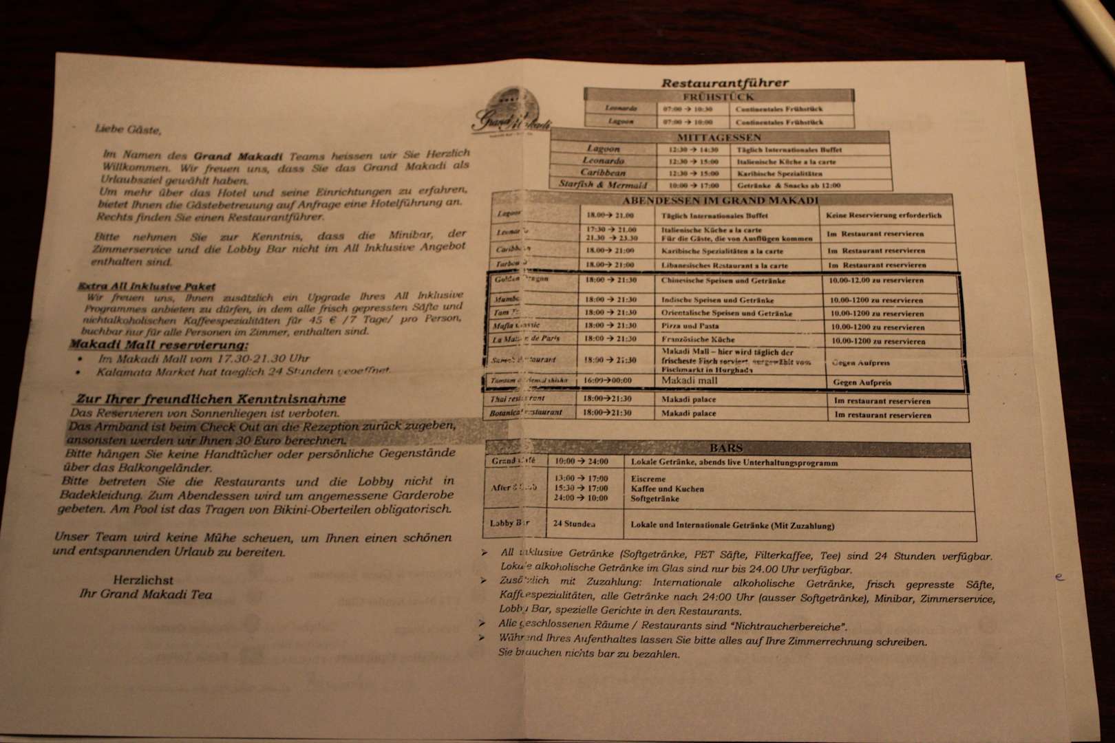 Allgemeine Information mit Minibar extra Vermerk