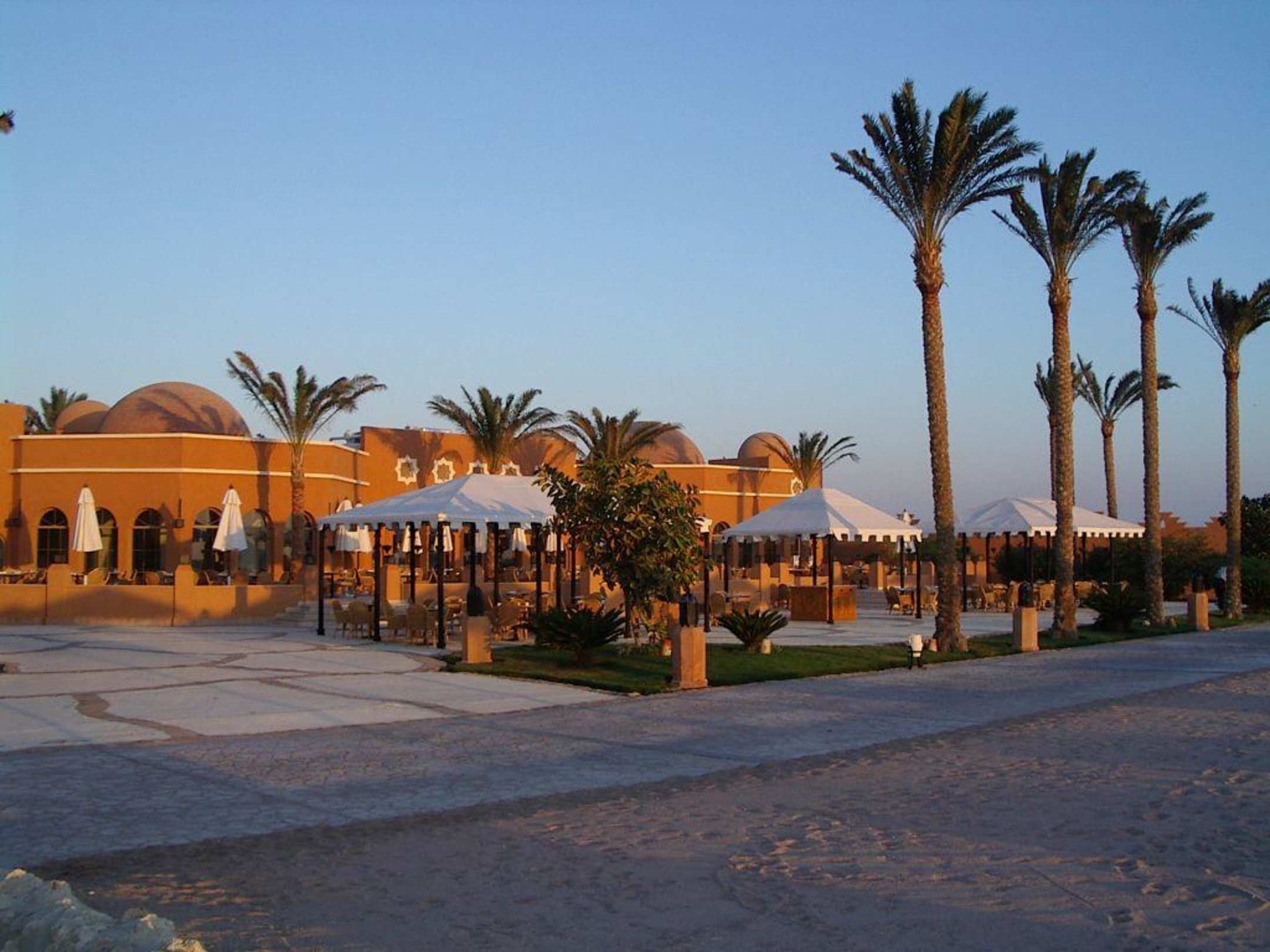 HauptrestaurantDas Hauptrestaurant des Grand Makadi fotografiert beim Sonnenaufgang! In diesem Restaurant konnte man auch frühstücken! Es war das einzigste Restaurant bei dem man für das Abendessen nicht reservieren musste! Im Italienischen, Libanesischen und im Karibischen Restaurant war für das Abendessen eine Reservierung nötig!