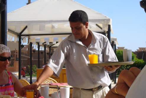Khaled bedient seine Gäste immer mit kleinen Scherzen. Mit ihm zu frühstücken-ein Erelbnis