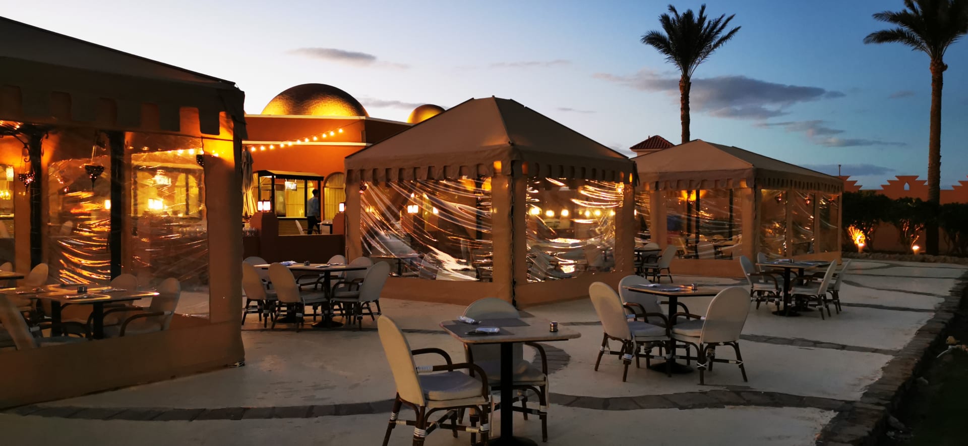 Gute Lösung mit den Pavillons vor dem Hauptrestaurant.
