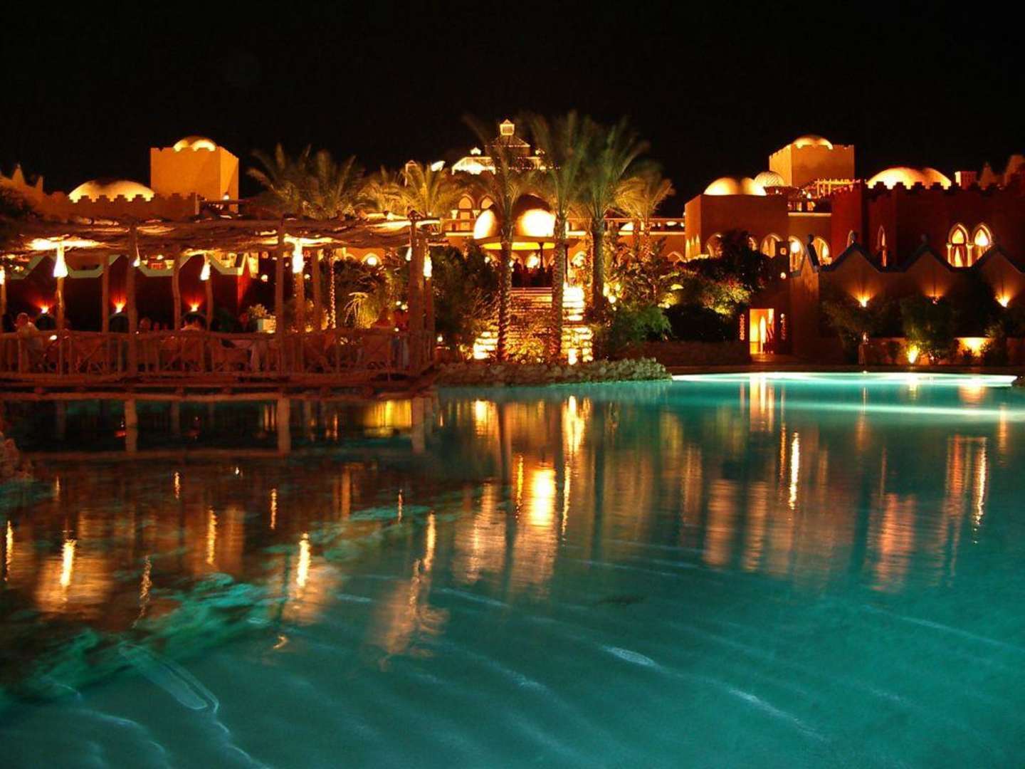 Grand Makadi Pool fotografiert bei Nacht! Links im Bild ein Teil des karibischen Restauant!