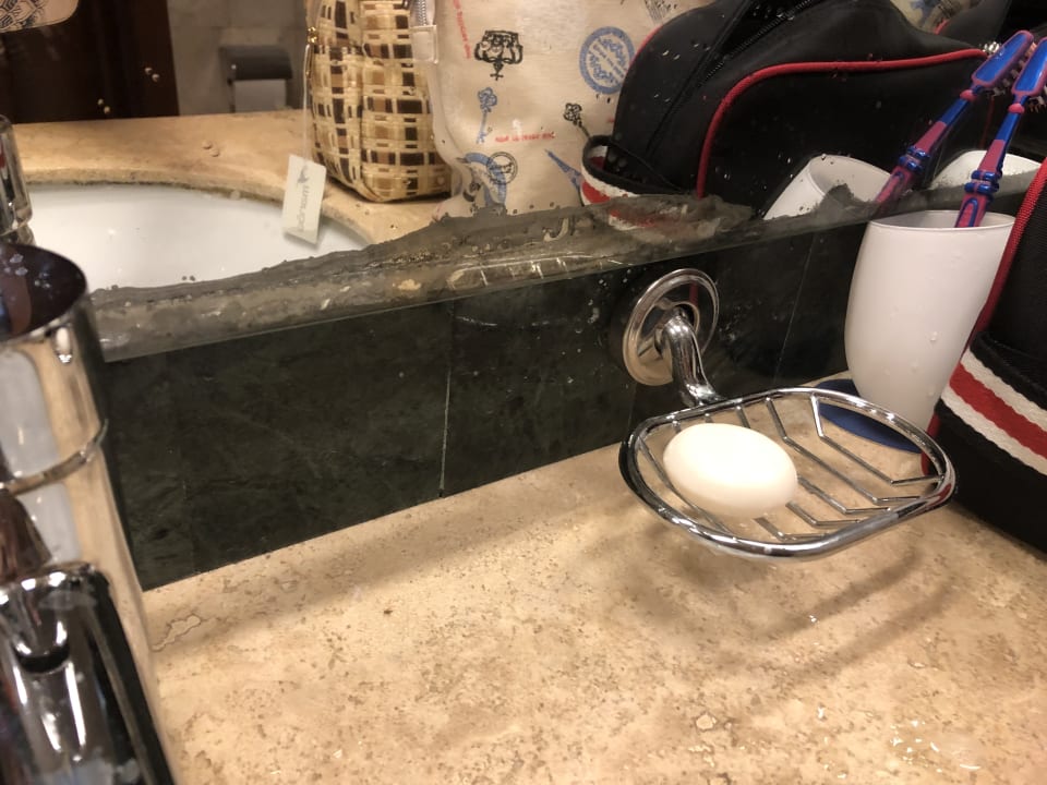 Bad mit versifftem Spiegel. Badewanne voll mit Haaren.