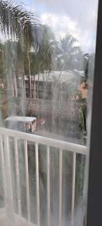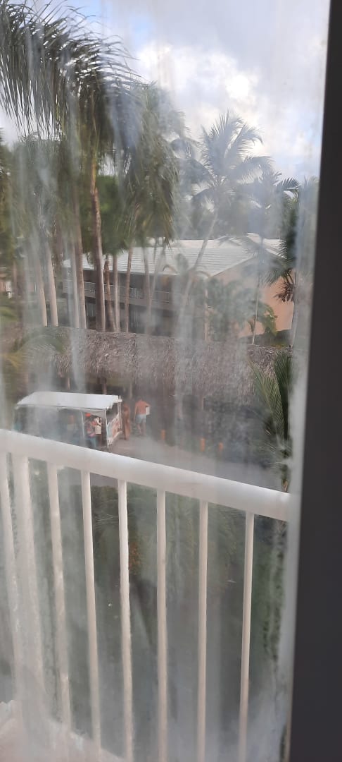 Blick aus dem Fenster. Es hat nicht geregnet. Die Fenster sind innen feucht und schmutzig.