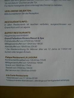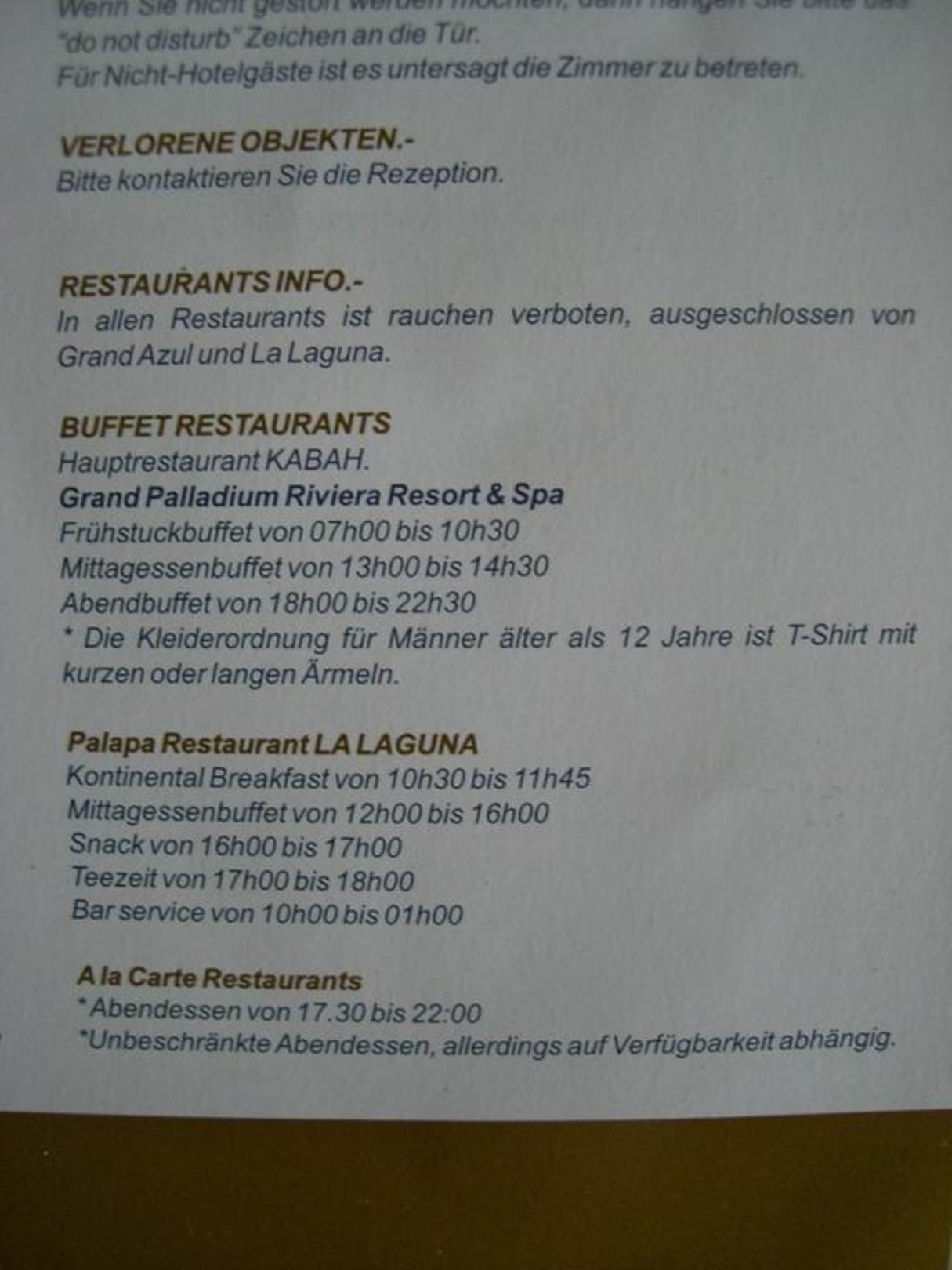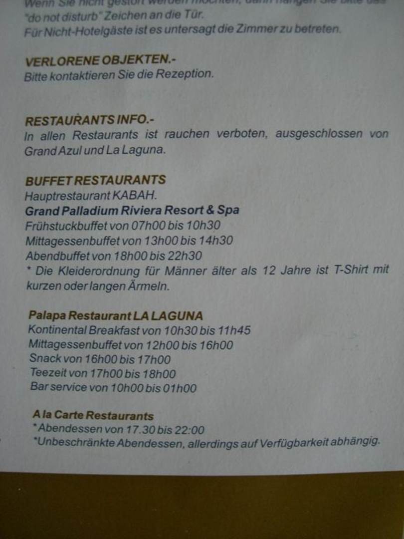 Die Öffnungszeiten der Buffet Restaurants LaLaguna und Kabah. Beide sollen angeblich morgens, mittags und abends geöffnet haben.