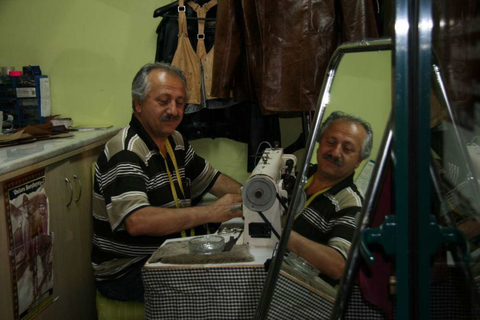 Ledermann bei der Schneiderarbeit