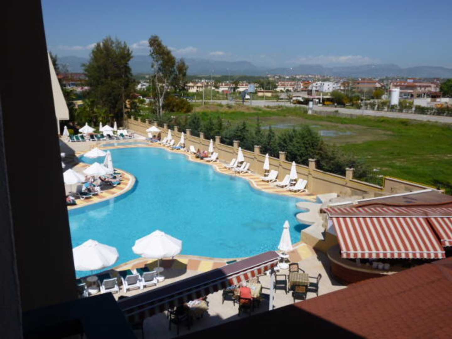 Aussicht auf die kleine Poolanlage vom Balkon