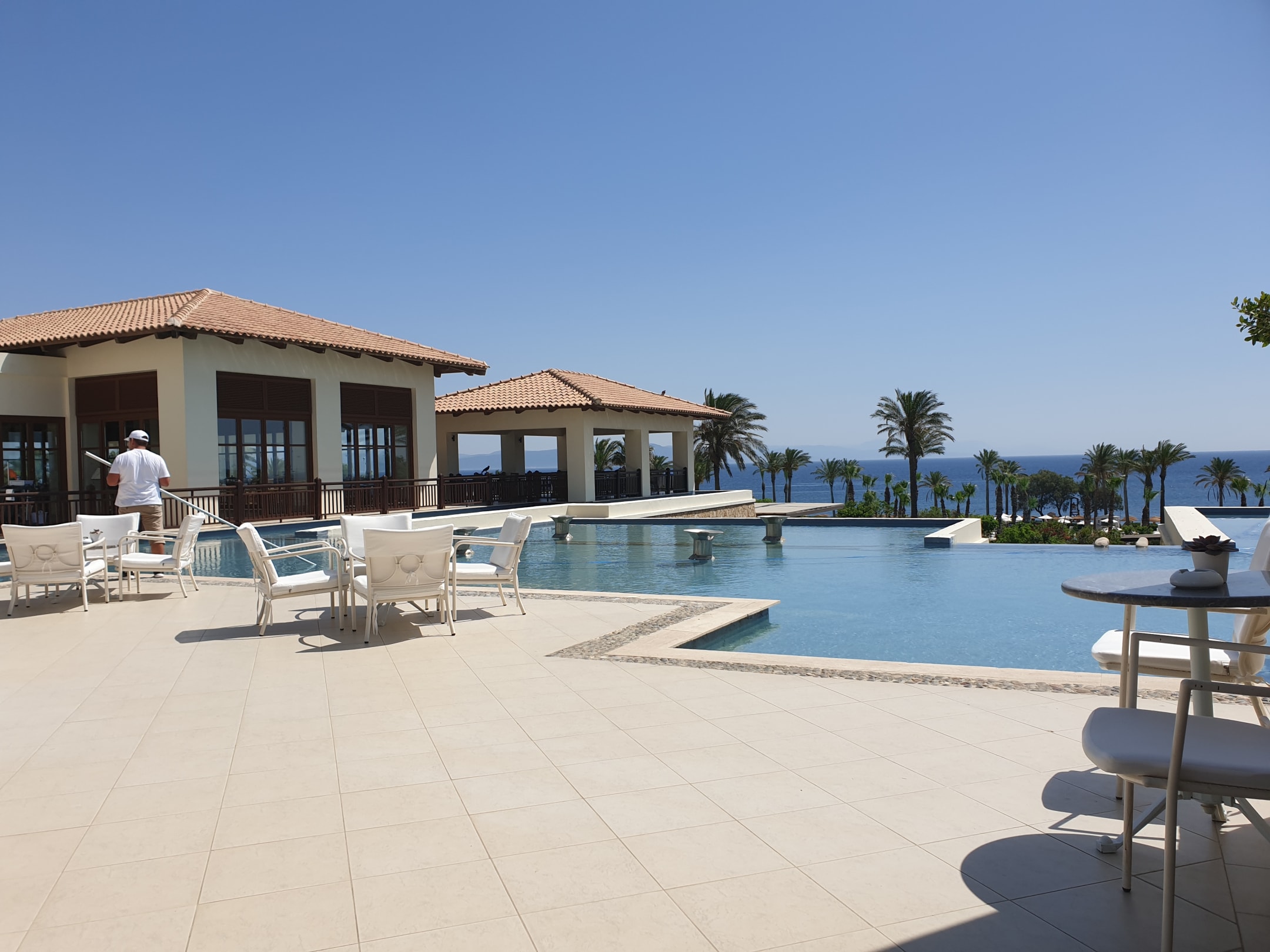 Ausblick von der Lobbybar aus auf Pools und Strand