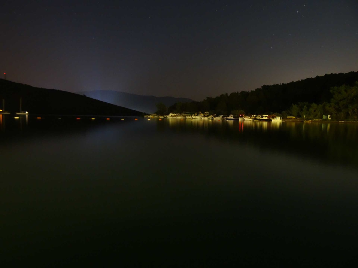 Blick auf die Badebucht bei Nacht im Hintergrund die Lichtstrahlen anderer Hotels