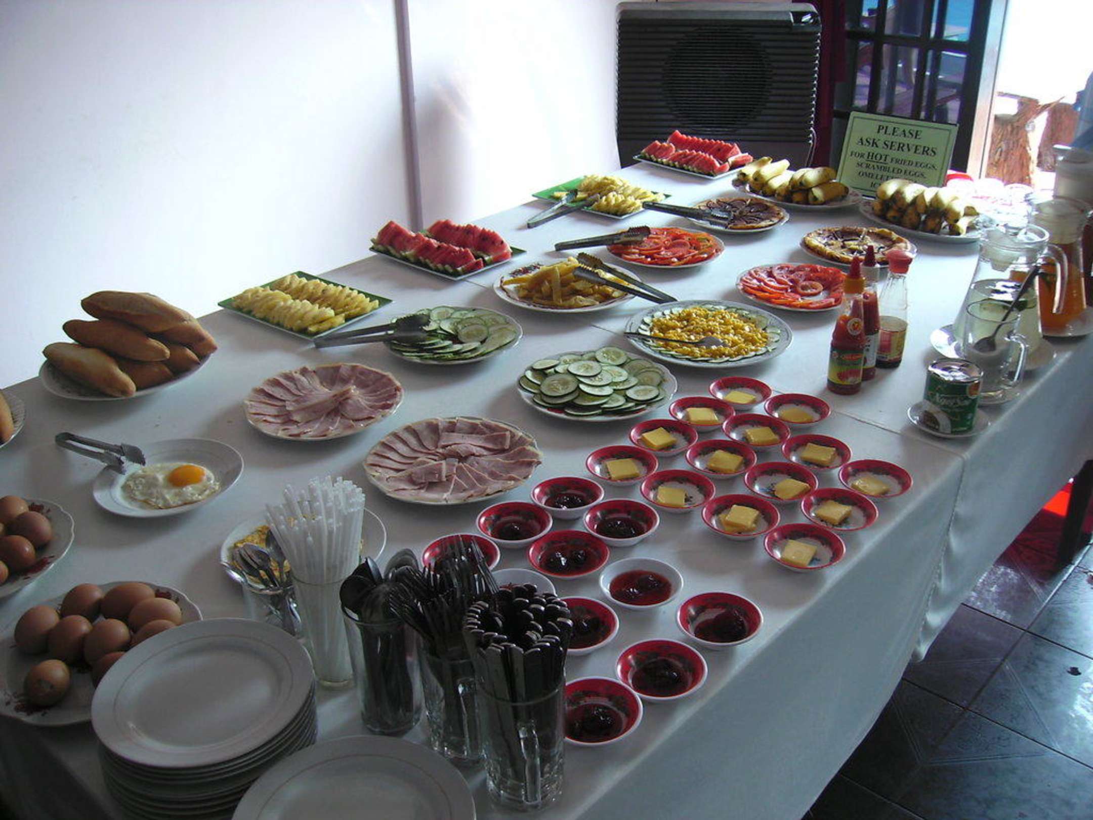 Schönes knusperiges Baquette Brot mit Aufschnitt, Eierspeisen frisch gebraten auf Wunsch. Leider stets Fliegenplage die mit starken Ventilatoren versucht wird zu vertreiben.