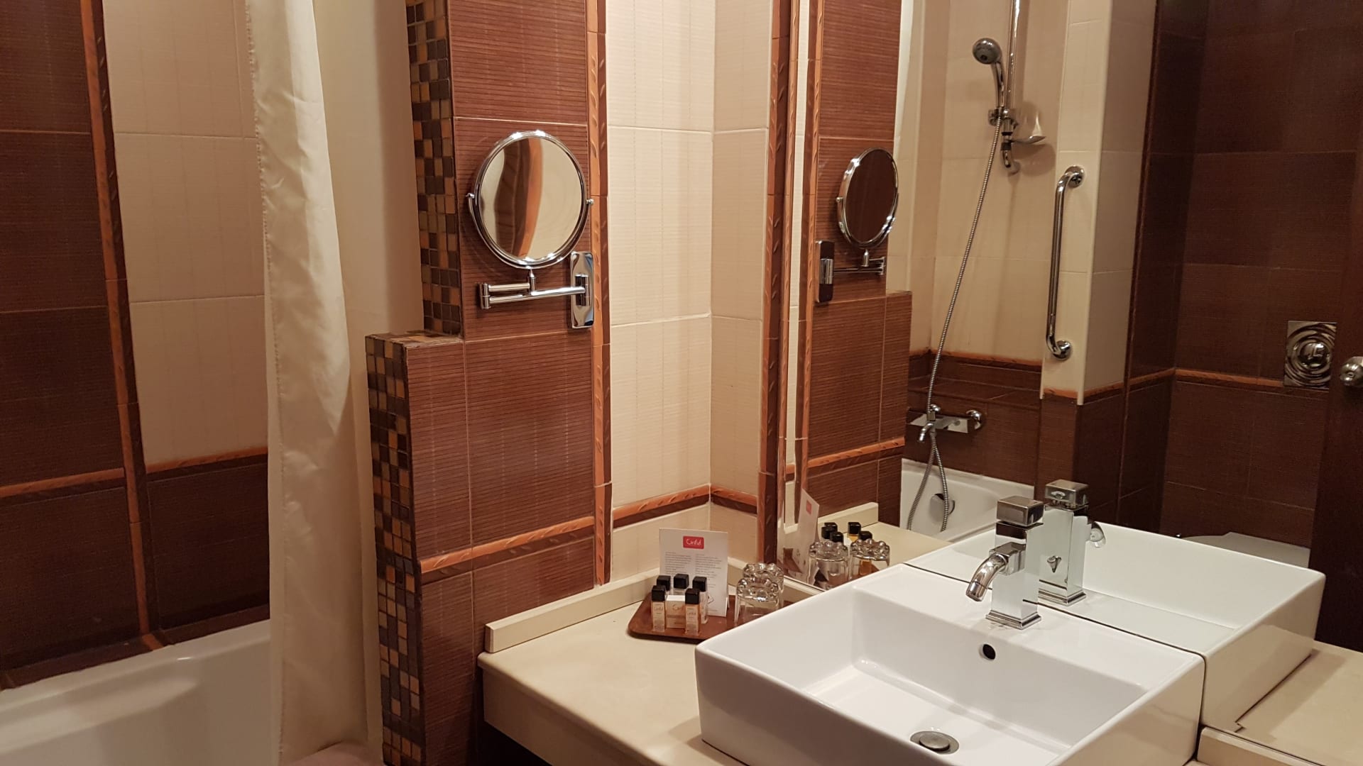 ZimmerDas Badezimmer, links Badewanne mit integrierter Dusche.