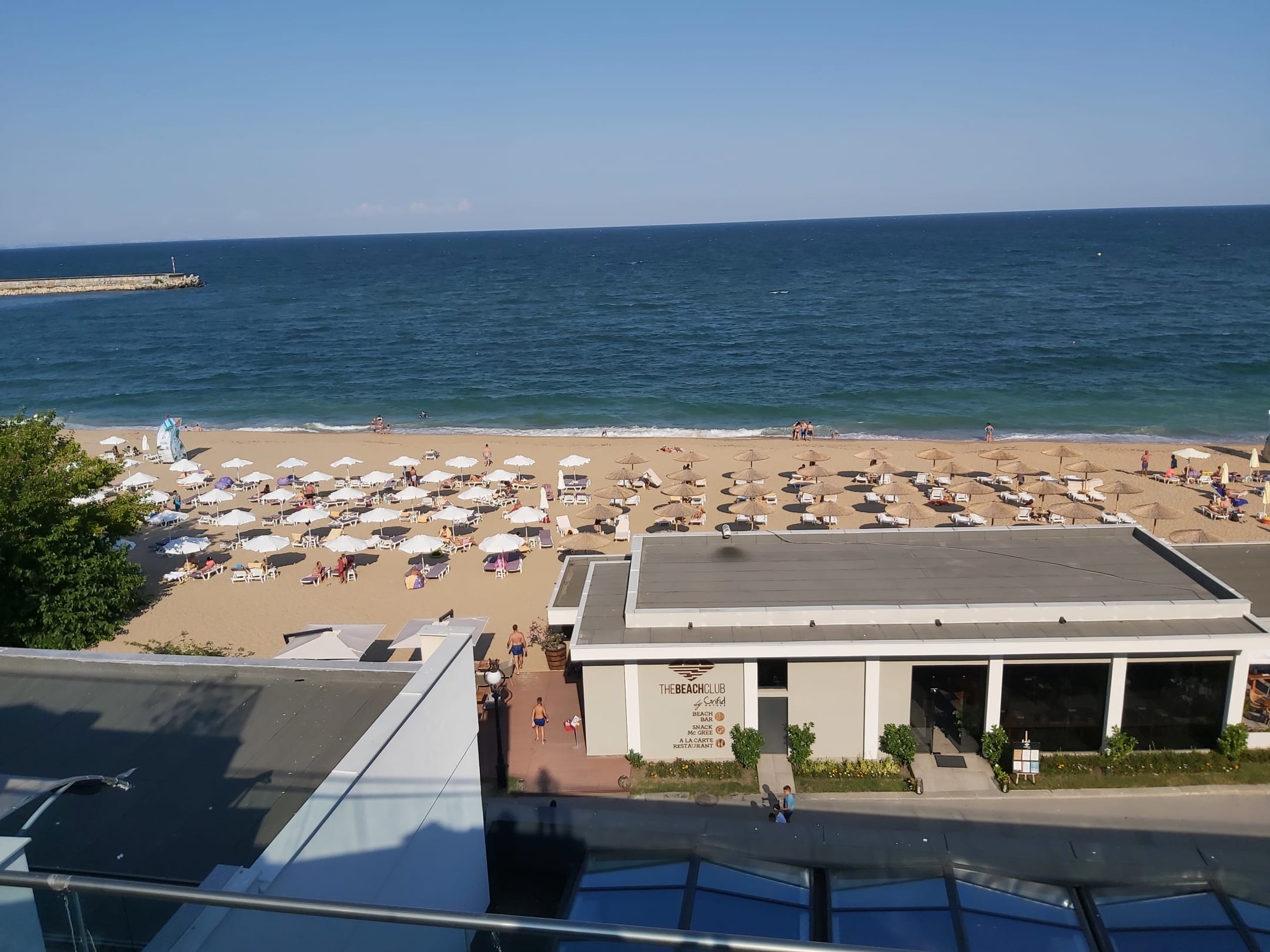 Blick vom Infinitypool auf den Strand und Strandbar