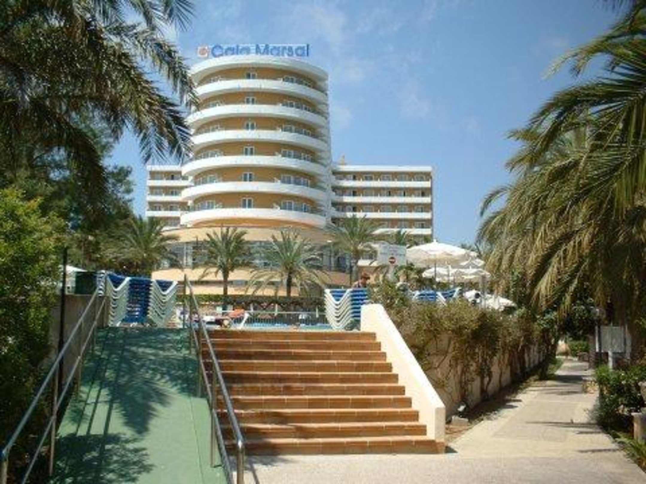 Hotel Cala MarsalFrontansicht des Hotels Cala Marsal in Porto Colom. Der Ausblock vom Hotel aus ist direkt auf das Strand und Meer (eine kleine Bucht)