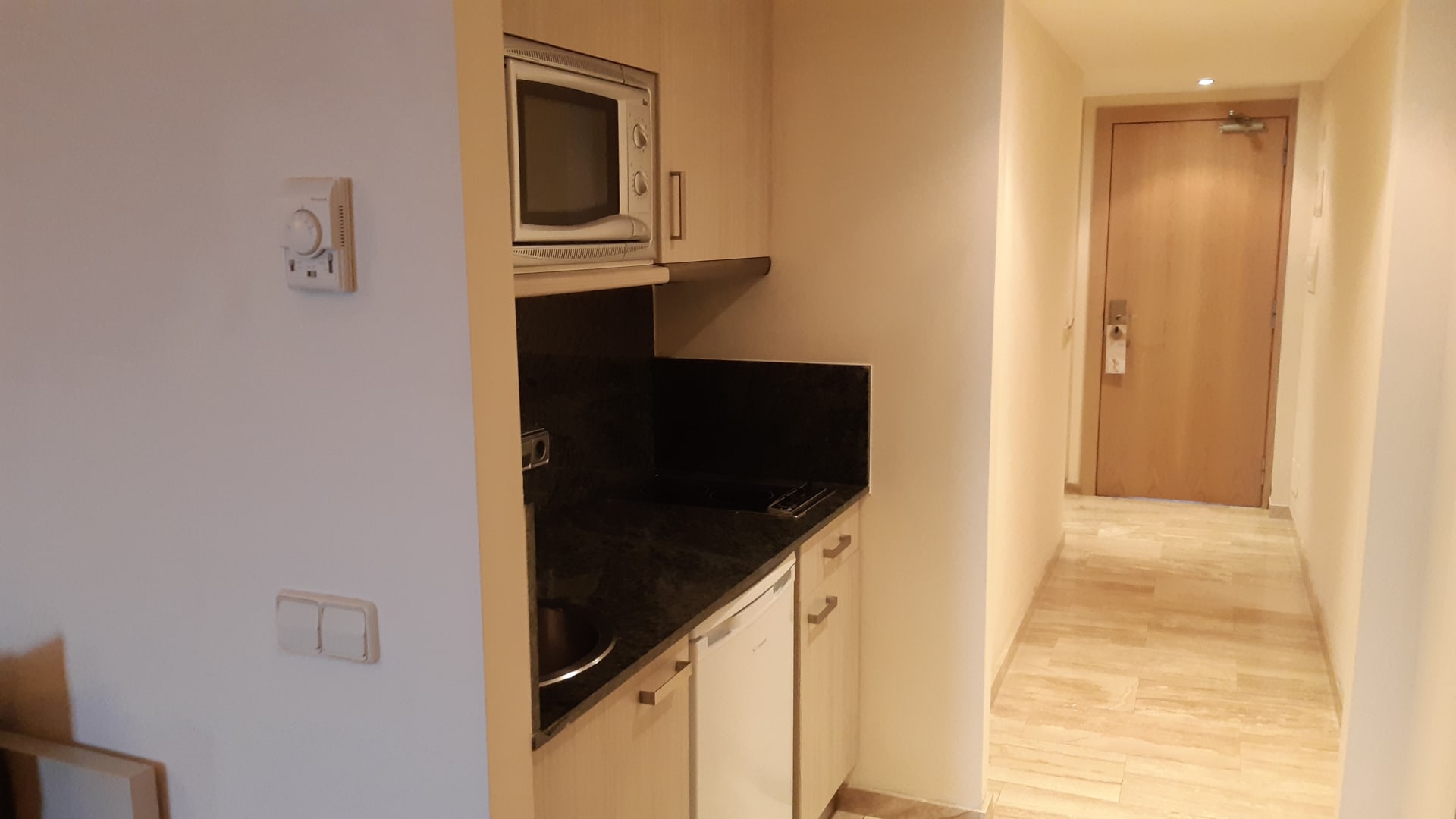Zimmer 314 Blick vom Wohnraum Richtung Eingangstür. In der Nische ist eine kleine Küche.