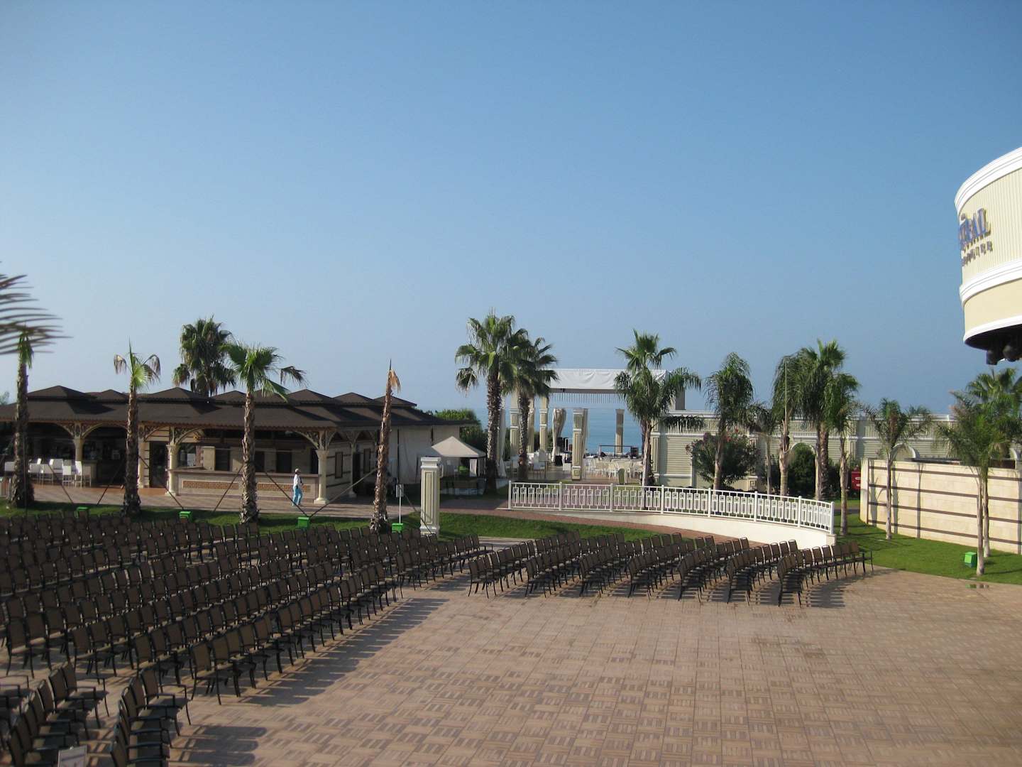 Blick von der Restaurantterrasse über das Theater zum Meer