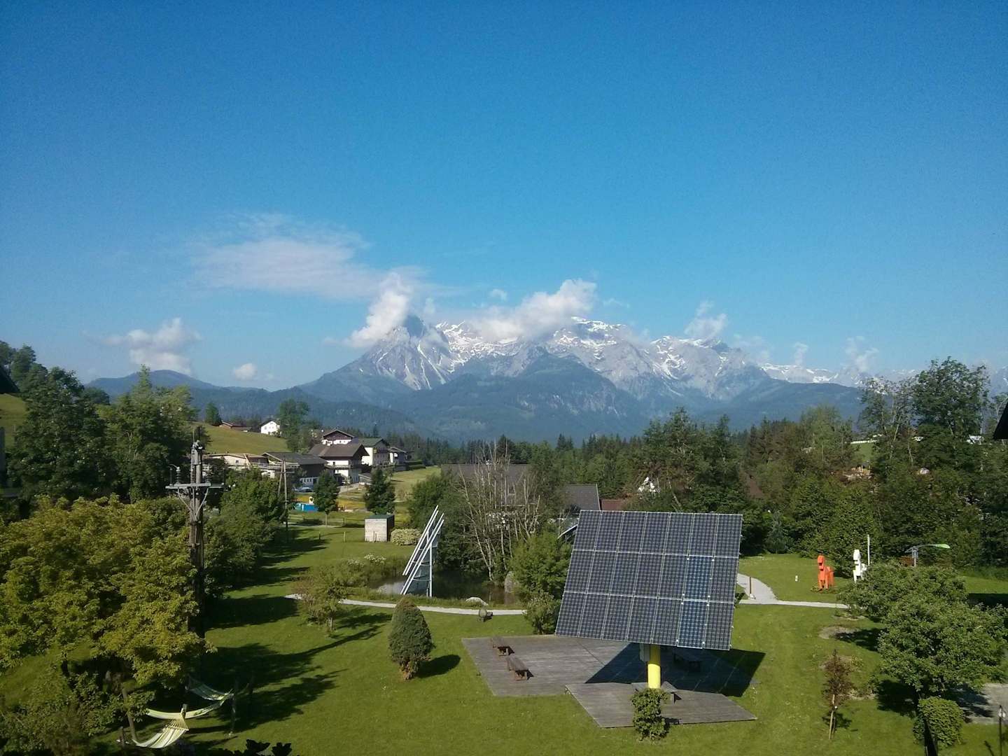 Blick aus dem Zimmer auf Garten und Alpenpanorama