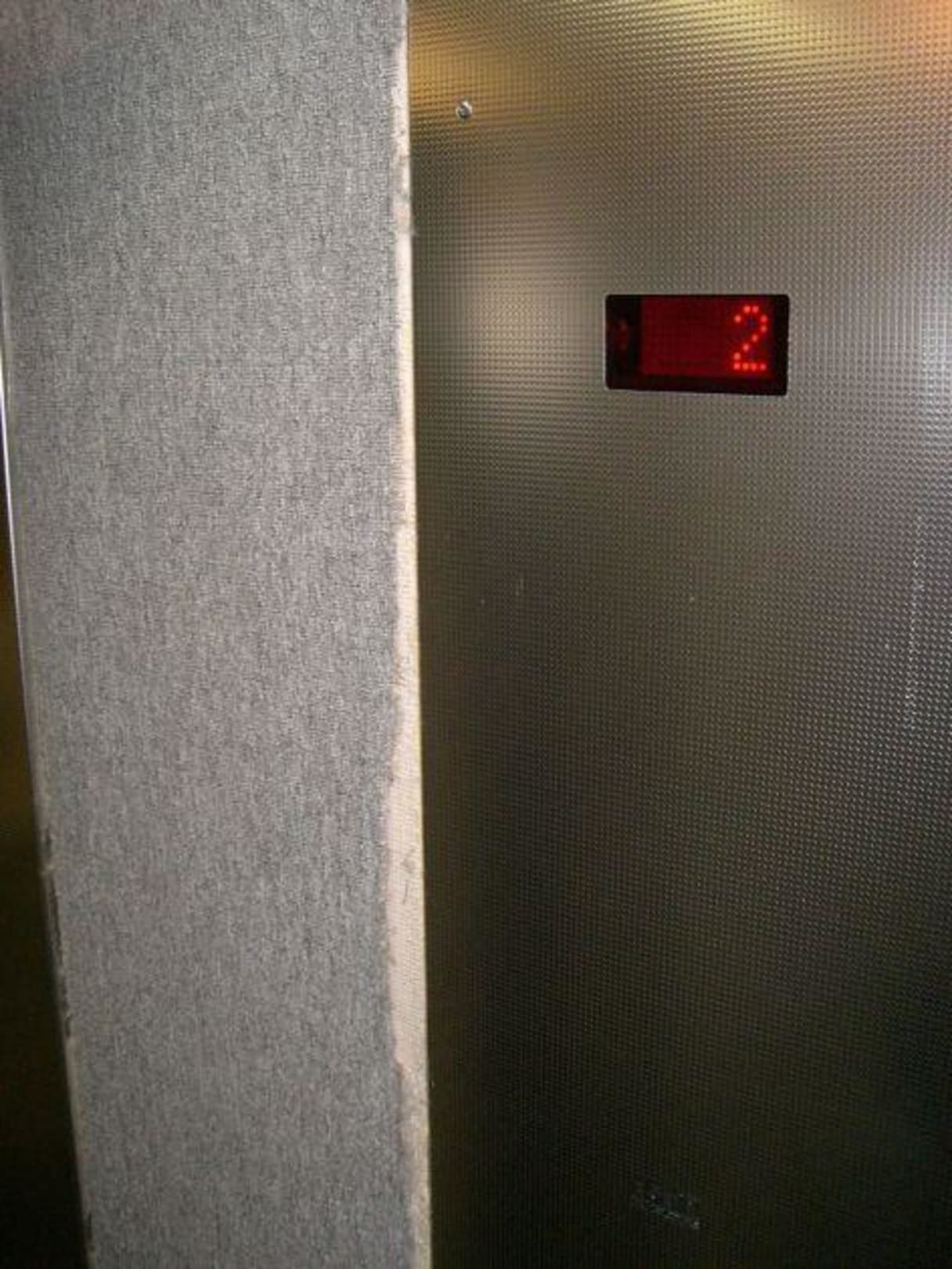 Aufzugskabine mit ausgefranster Teppichverkleidung... auch sehr einladend - oder ist das der Lastenaufzug ?