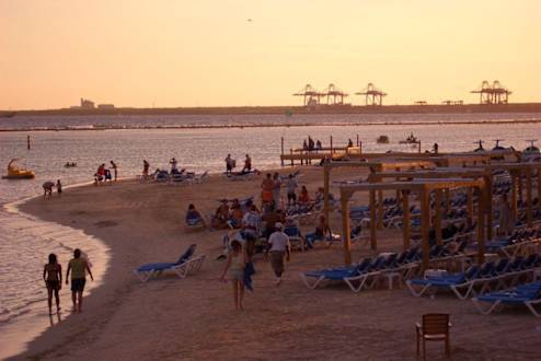 belebter Hotelstrand mit Lastkrahnhorizont