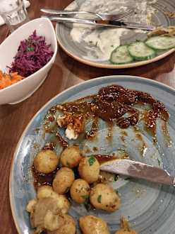 tgl. geriebene Möhren entweder mit Krautsalat oder roter Beete. Dicke Soße aus der Tüte mit trockenem Hühnerfleisch ohne Geschmack. Auf keinen Fall Abendessen mit buchen!!!