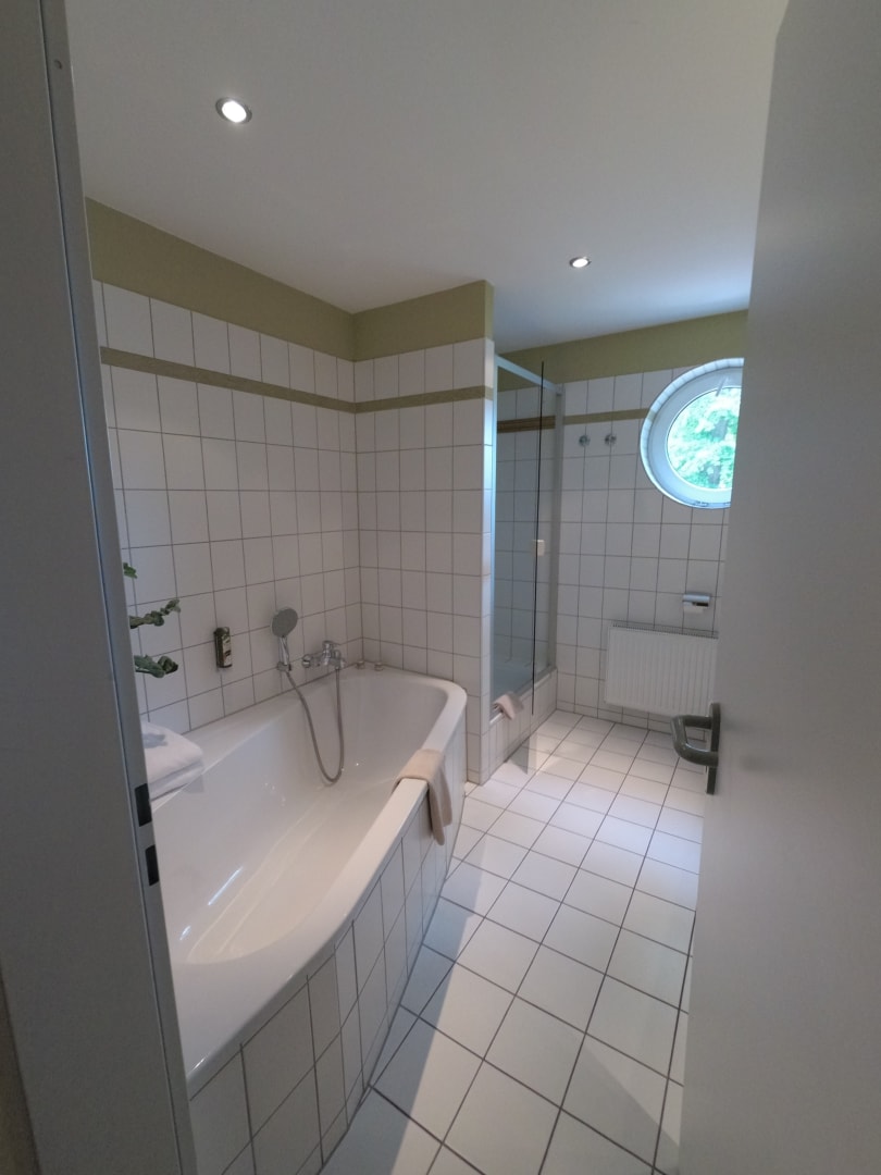 Badezimmer mit Badewanne und Dusche.