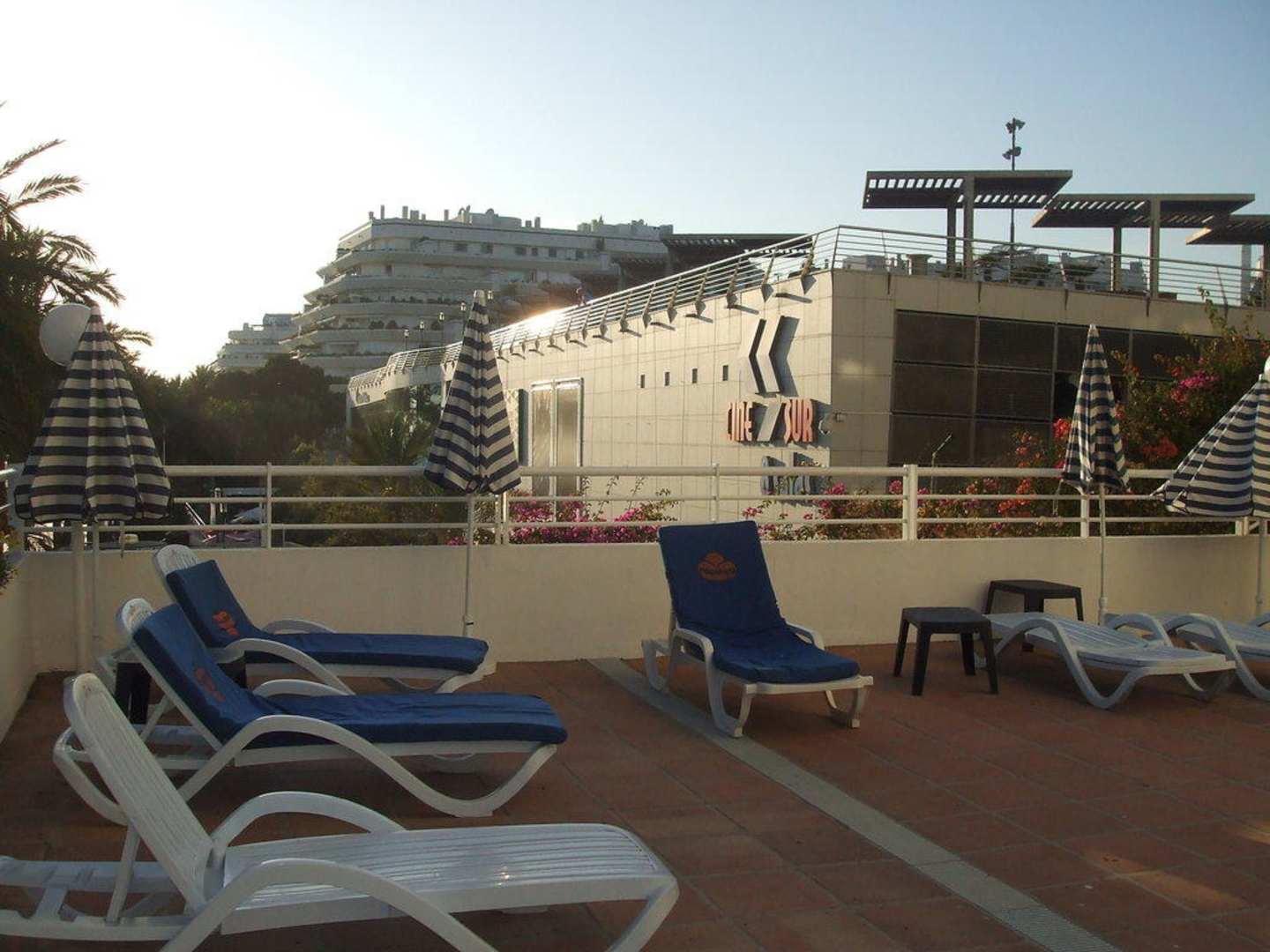 Die Aufnahme zeigt einen Teil der Poolterrasse der Hapimag-Anlage Marbella mit Blickrichtung zum Mehrzweckgebäude auf bzw. unter der "Piazza" hin.