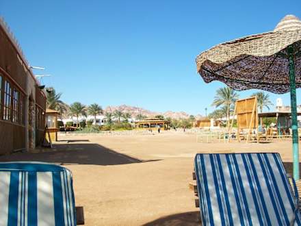 StrandlebenBlick von der Liege mit Strandbar links und Hotel geradeaus, das Meer direkt hinter mir.