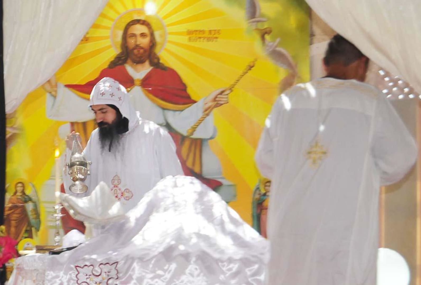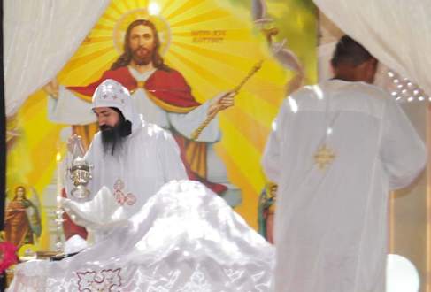 Osterliturgie im TanzsaalMitten im Strandterrain wurde der Saal für die Abend- und Mittagsanimation für die koptische Liturgie freigestellt.