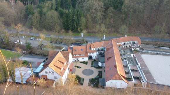 Blick von der Burg auf Hotelanlage