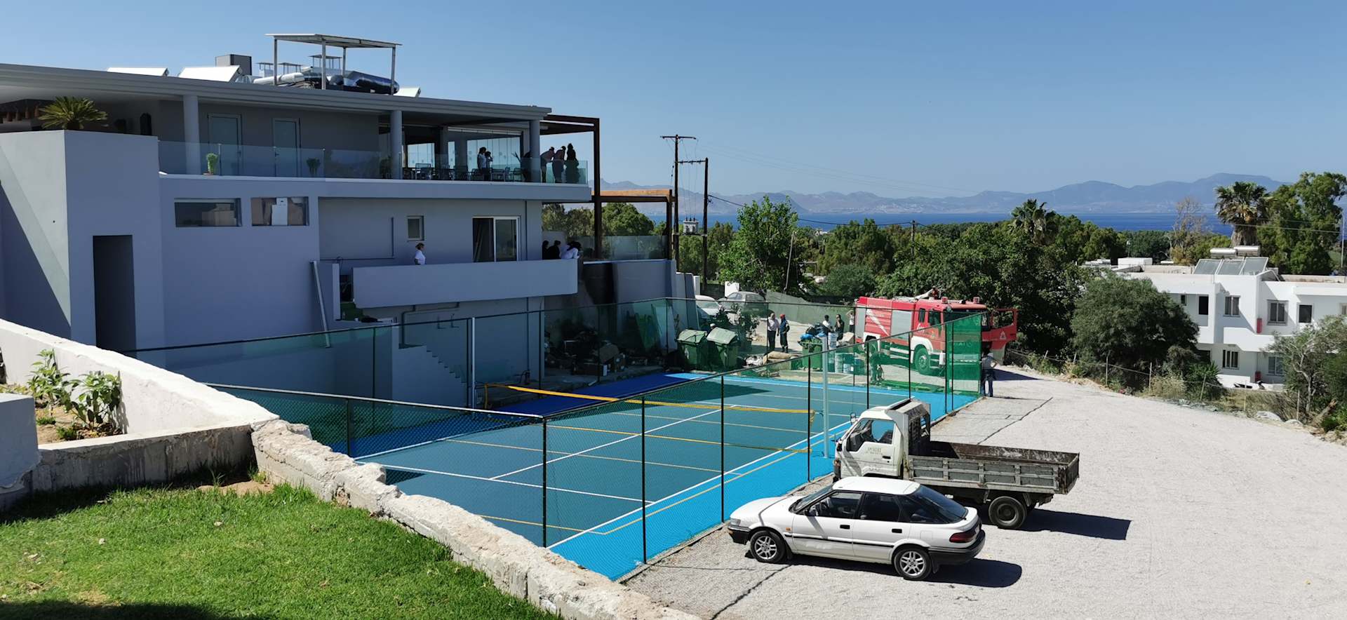 Ausblick aus unserem Swim-up-Zimmer auf den Brand in der Müllstation am 2.6.2019 um 14.43 Uhr. Die Feuerwehr mußte nicht mehr eingreifen. Die Hotelmitarbeiter hatten mit großem persönlichen Einsatz gelöscht.