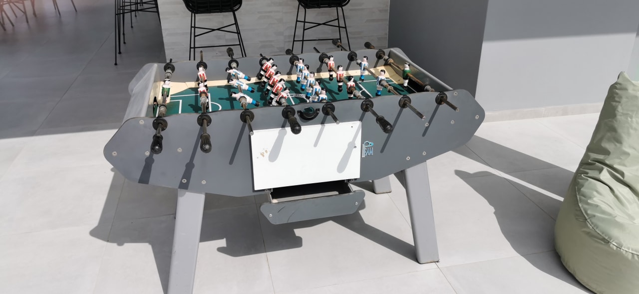 Der alte Kicker mit verrosteten Stangen wurde im Laufe unserer "Urlaubs"-Woche aufgestellt. Ärgerlich: Wenn mit Kraft geschossen wird, knallen die Bälle wie Pistolenschüsse. Man sollte einen anderen Standort wählen.
