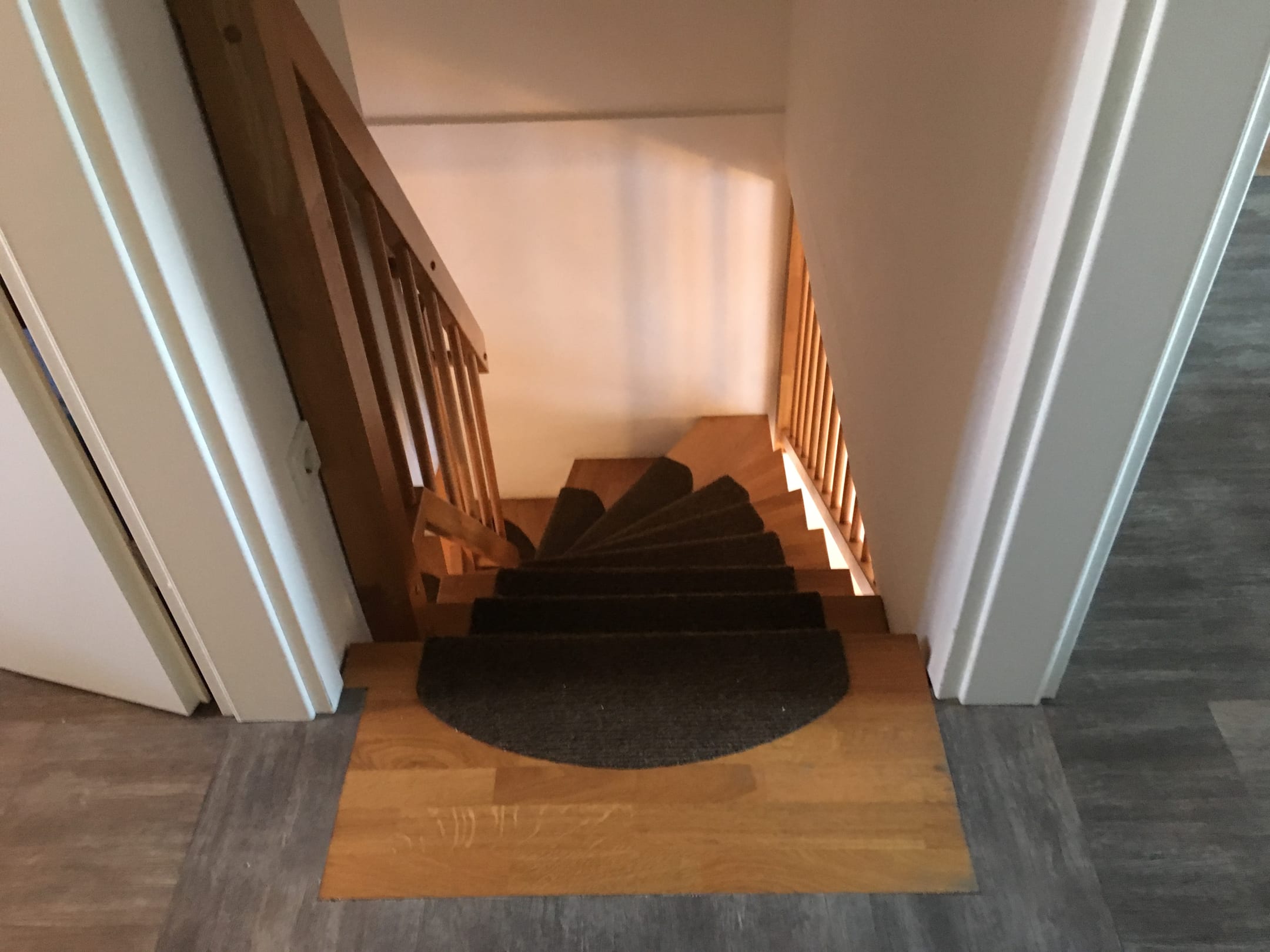 Steile Treppe ohne Sicherung. Rechts und links die Schlagzimmer.