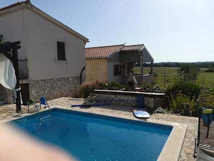 Da wohnt die Vermietern und passt auf das kein Kind in den Pool springt.