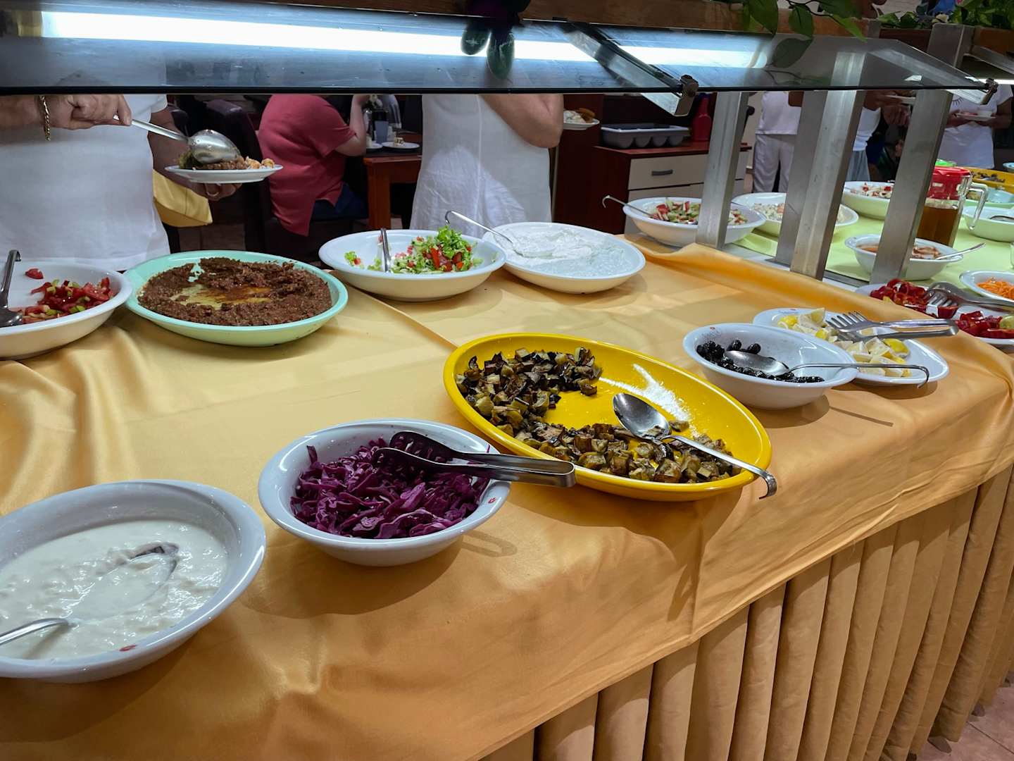 Keine Beschriftungsschilder, Schade! Es standen viele Teller da, aber teilweise hat sich die Auswahl oft wiederholt wie z.B. Salate. Wir waren allerdings nie hungrig und fanden immer etwas leckeres zu essen.