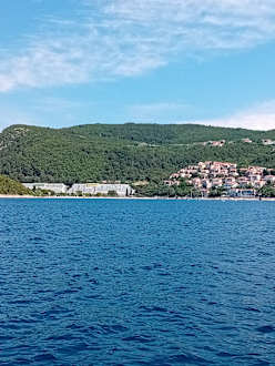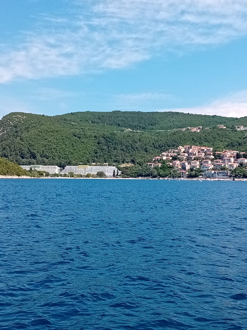 Hotel mit Rabac vom Boot aus gesehen.