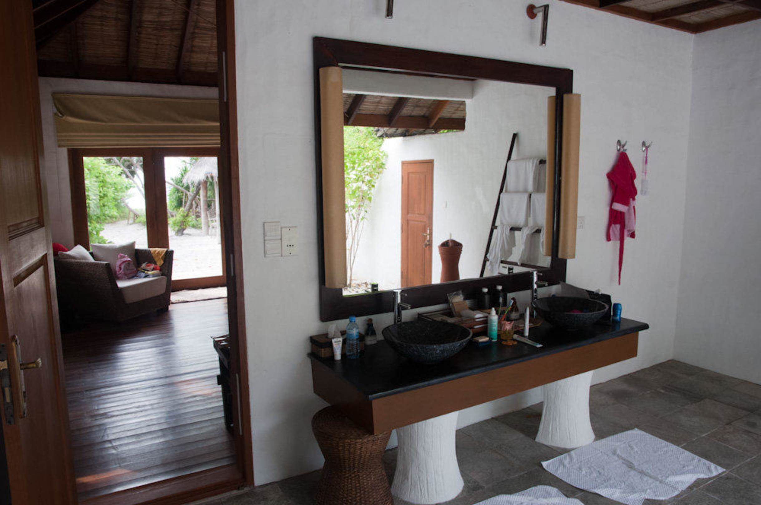 Badezimmer mit Blick durch die Türe ins Schlafzimmer eines Raamba Retreat
