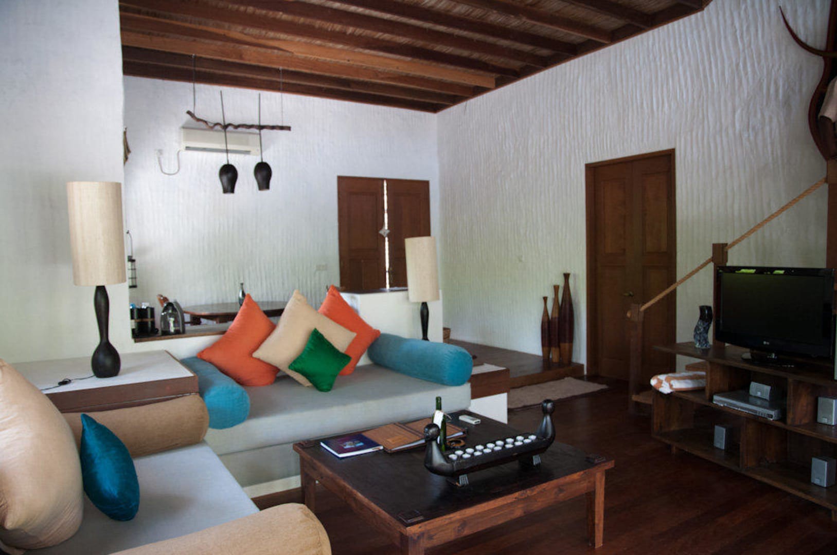Wohnzimmer Dhonakulhi ResidenceWohnzimmer einer Dhonakulhi Residence mit Treppe zur Dachterrasse (links)