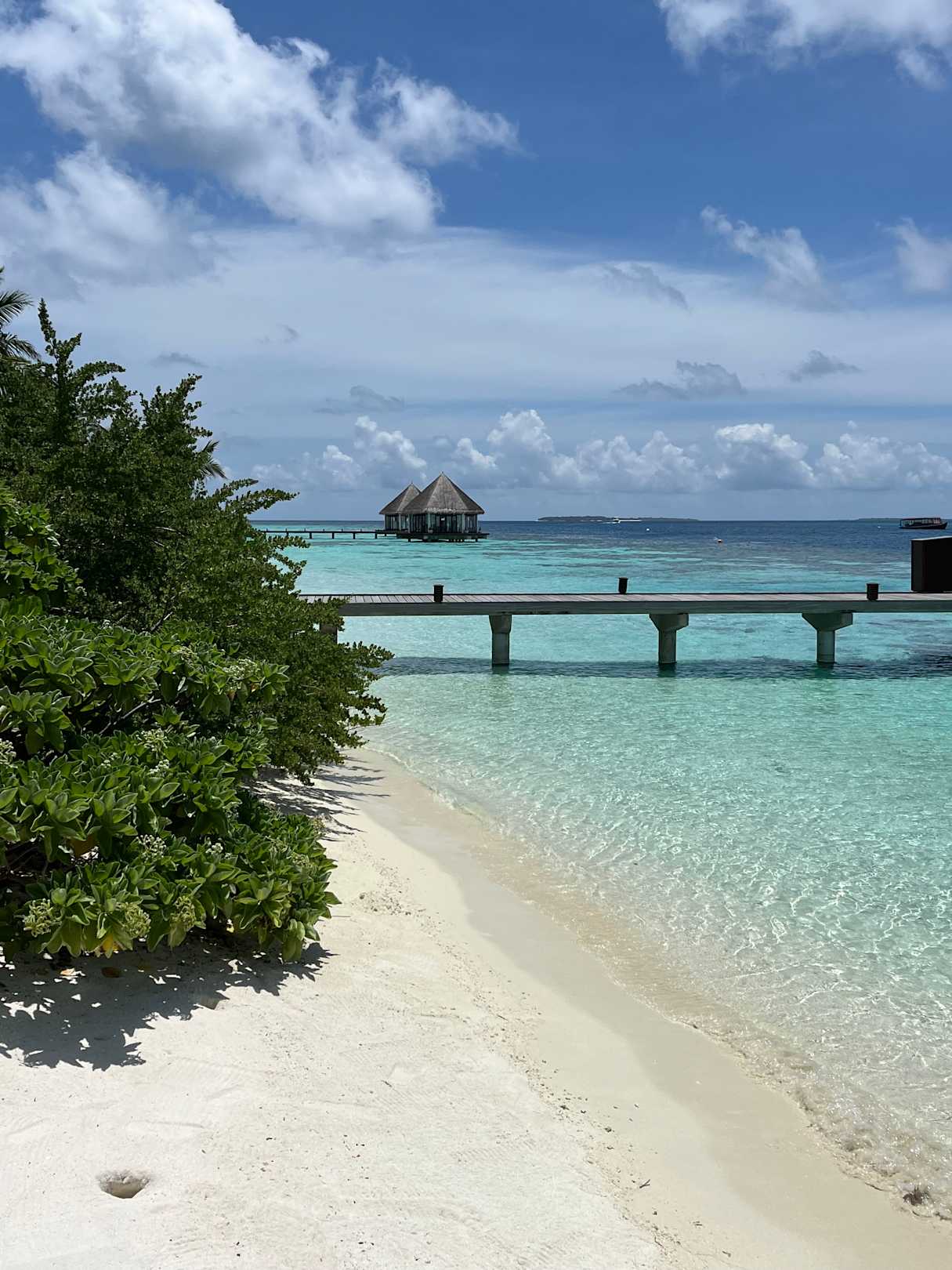 Blick von Ankunftssteg Richtung Restaurant mit den Hochzeitspavillions im Meer