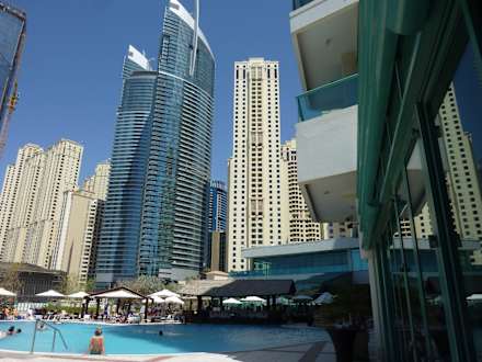 Poolanlage und im Hintergrund die Hochhäuser
