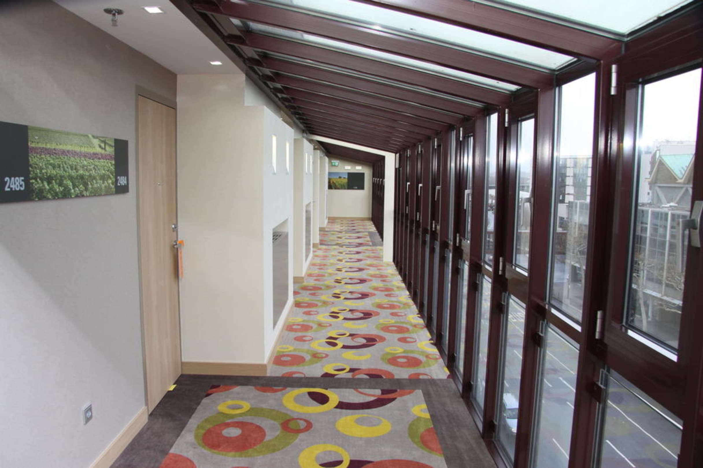Im 4. Stock des Domflügels führt der Weg zu den Zimmern immer wieder winter- oder dachgartenartig an der Straße entlang. Schöne Atmo. Neue Zimmerschilder und neuer Teppich.