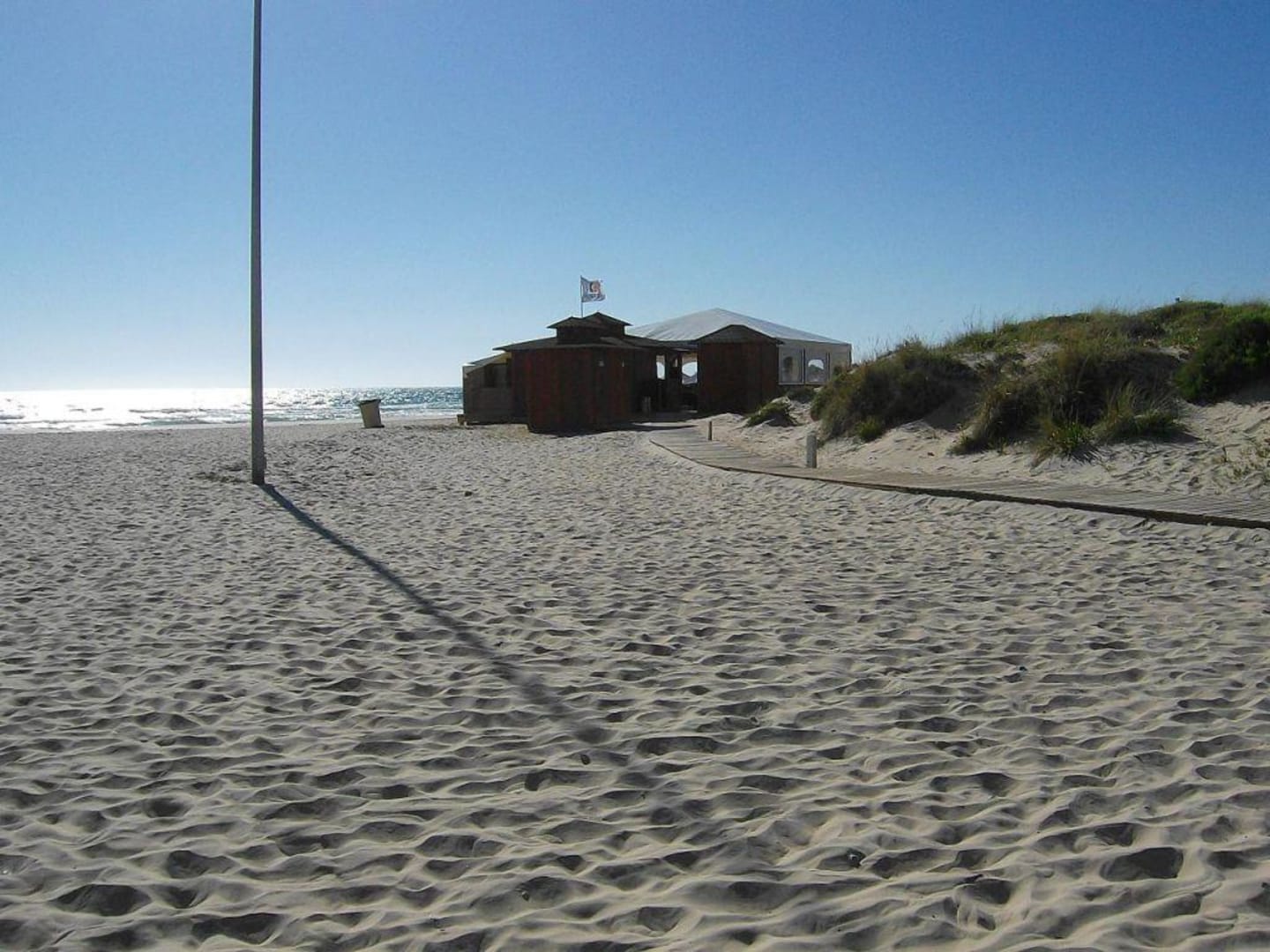 Strandim hintergrund sieht man das toilettenhäuschen und die strandbar vom barrosa palace