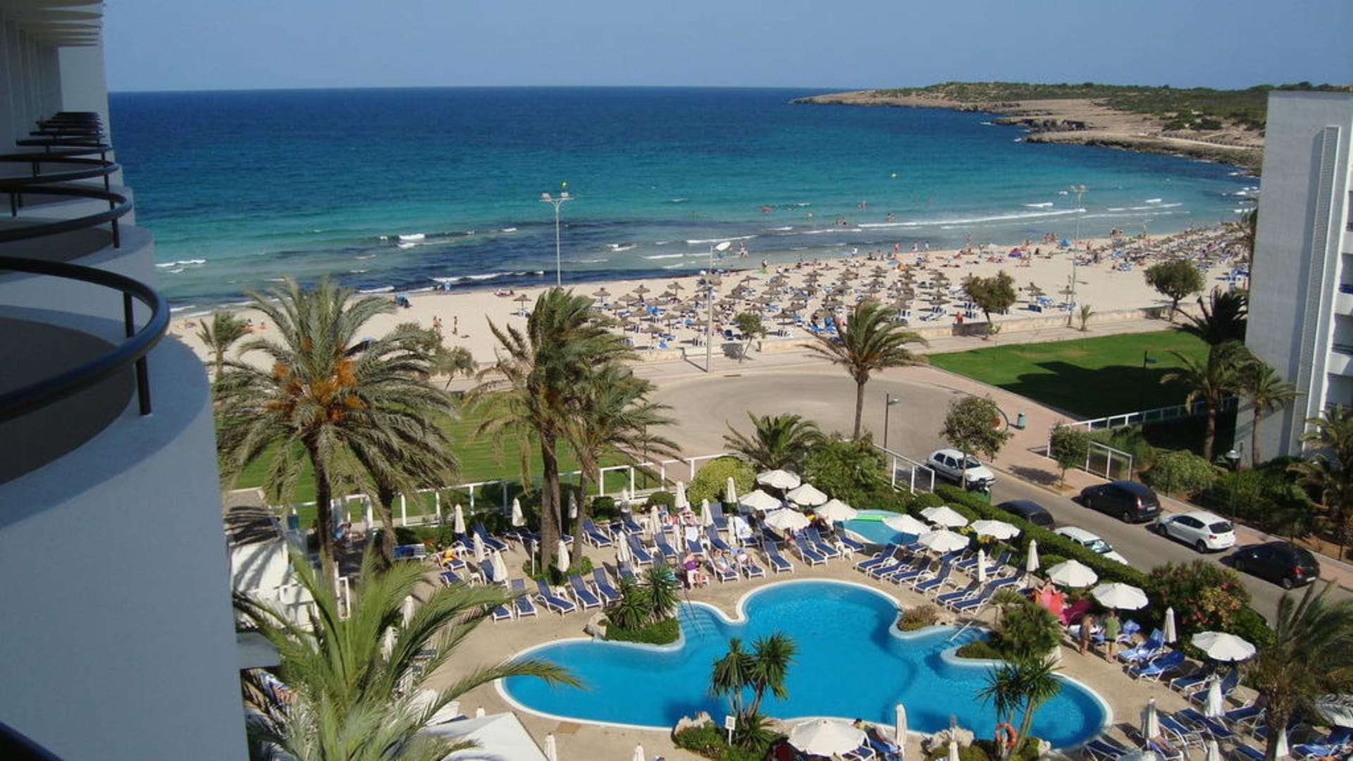 Blick über den Pool zum Strand vor dem Hotel