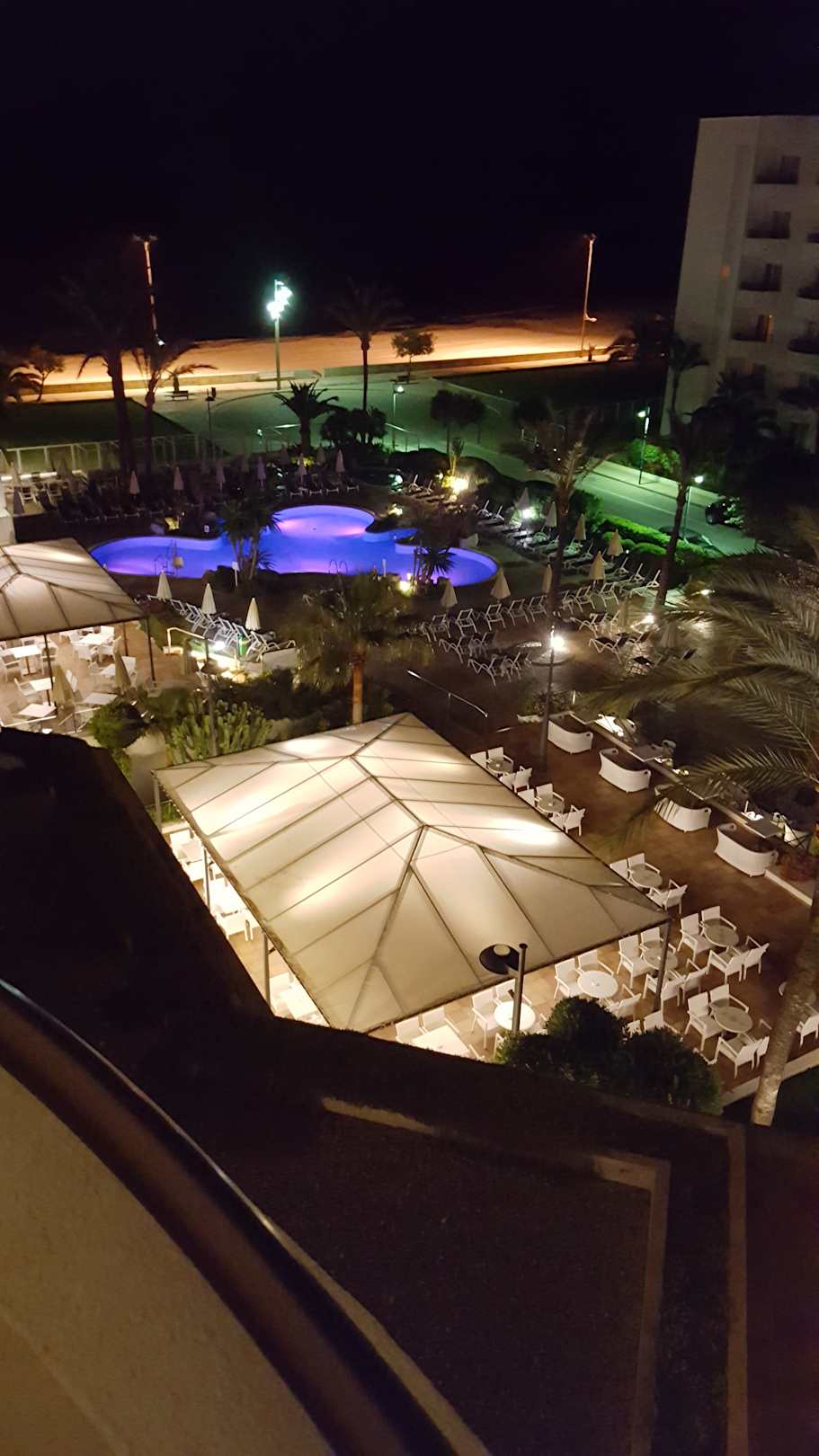 Blick vom Zimmer auf Pool, Hotel-Cafe und Strand