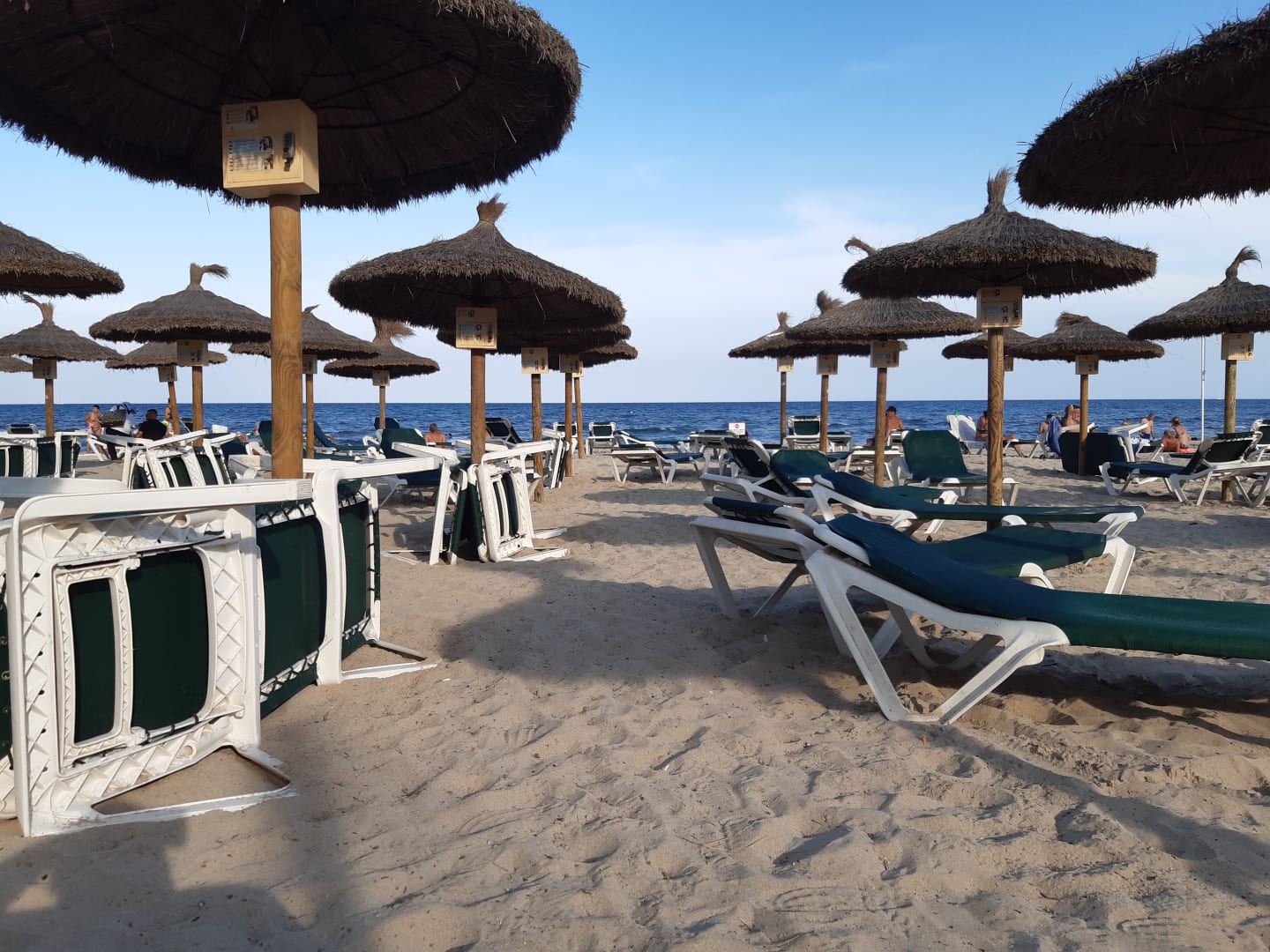 Strandabschnitt direkt vor dem Hotel. Es gibt auch Abschnitte ohne Schirme. Ich habe für 2 Liegen und 1 Schirm EUR 14 / Tag bezahlt. Alles sehr sauber gehalten am Strand.