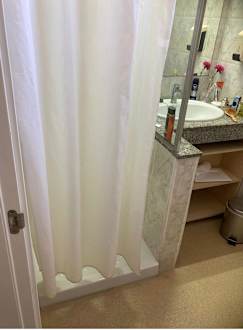 Duschvorhang. Zu kurz. Wasser läuft raus.