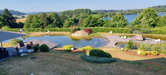 Blick vom Zimmer auf den Garten und den See im Hintergrund