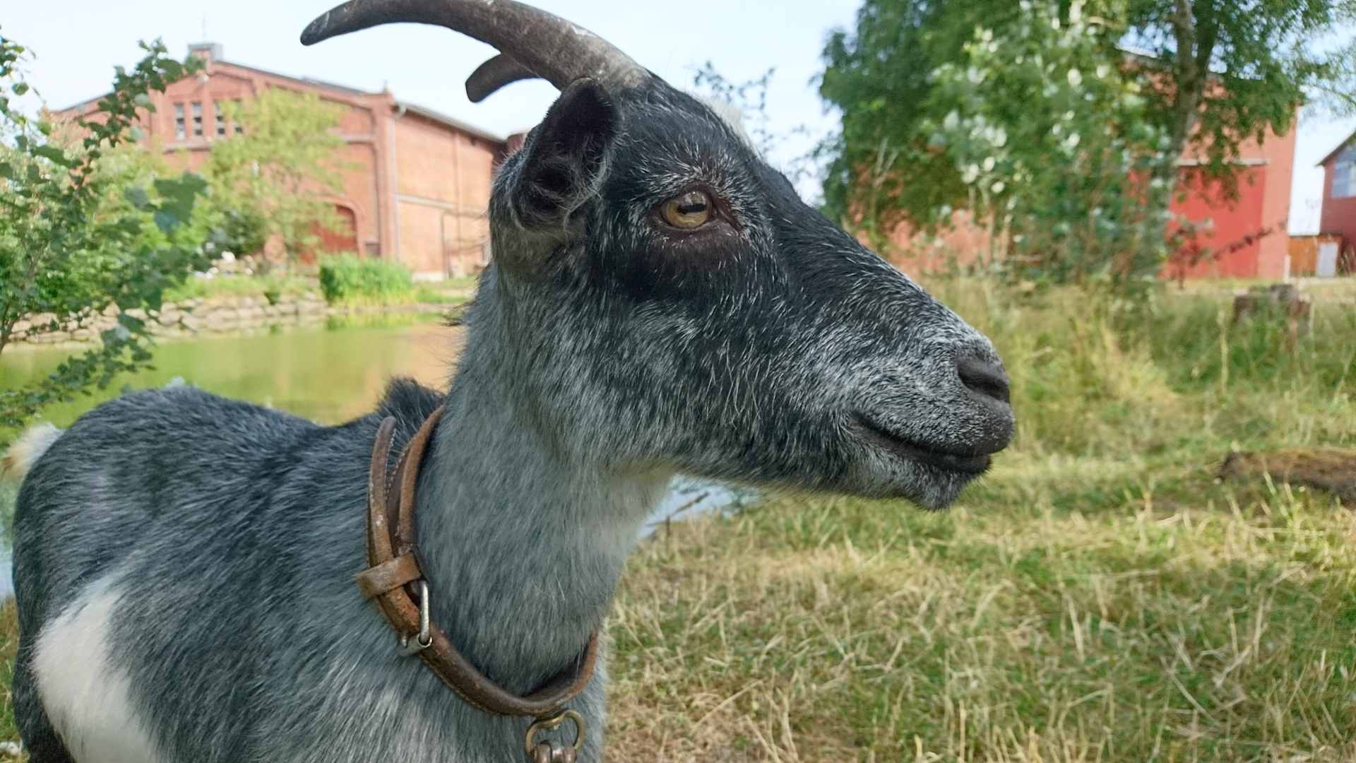Eine der beiden Ziegen auf dem Hof, im Hintergrund die Pferdeställe.