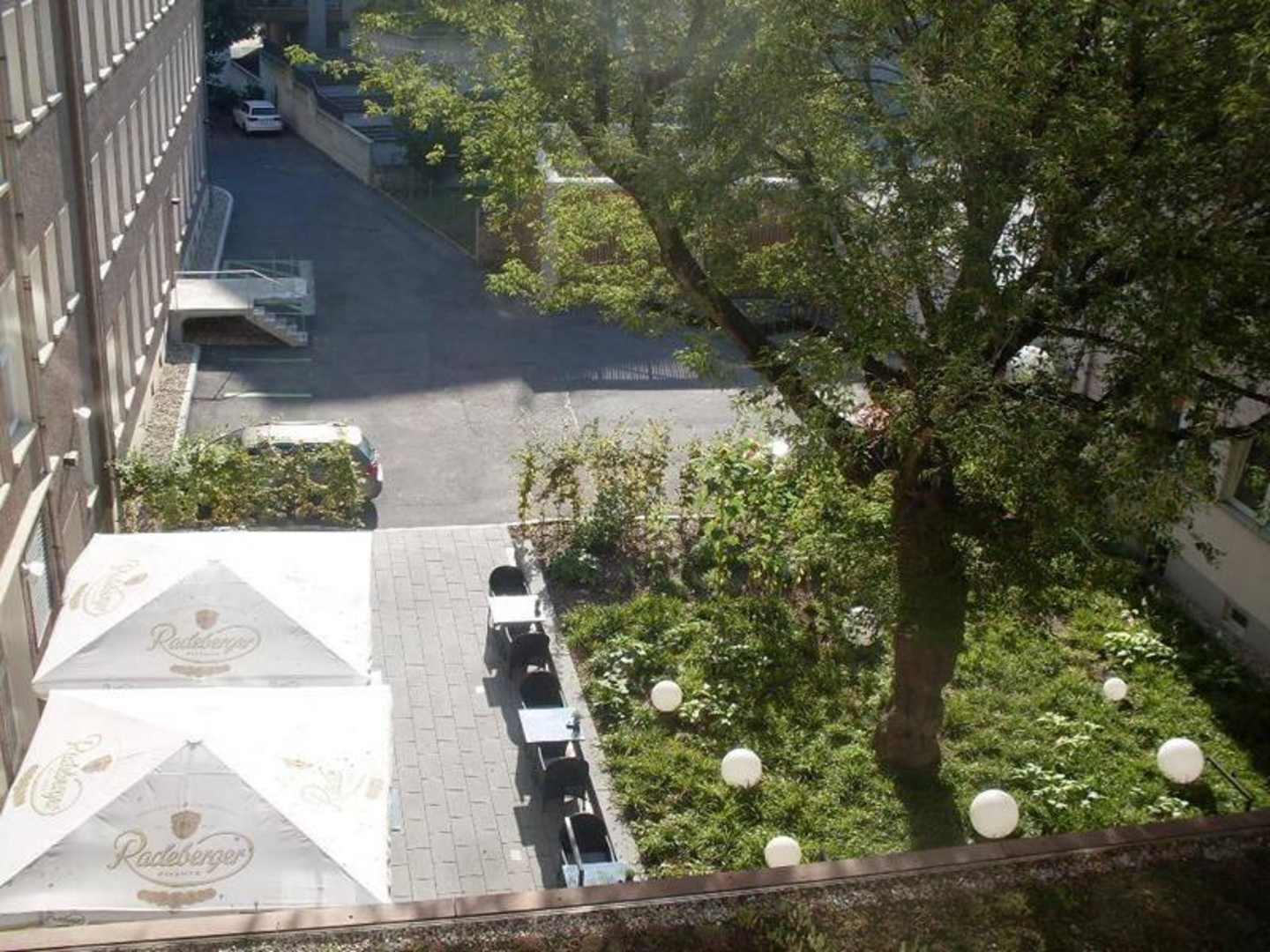 Blick aus dem Zimmer in der vierten Etage auf die Gartenterrasse des Hotels.