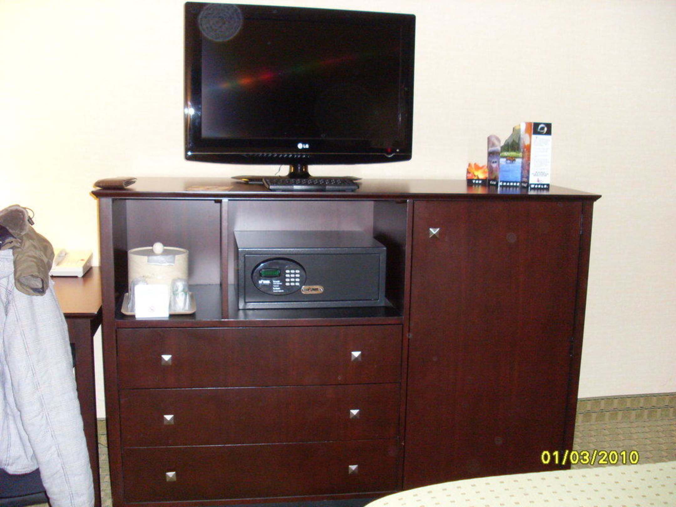 Der Schrank mit Flat-TV, Safe, Mikrowelle und Kühlschrank.