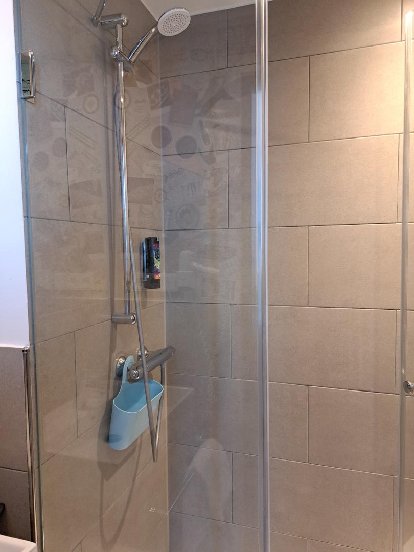 Dusche geräumig mit Shampoo und weichen Badetüchern