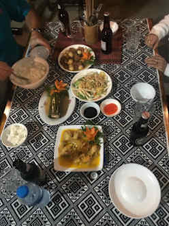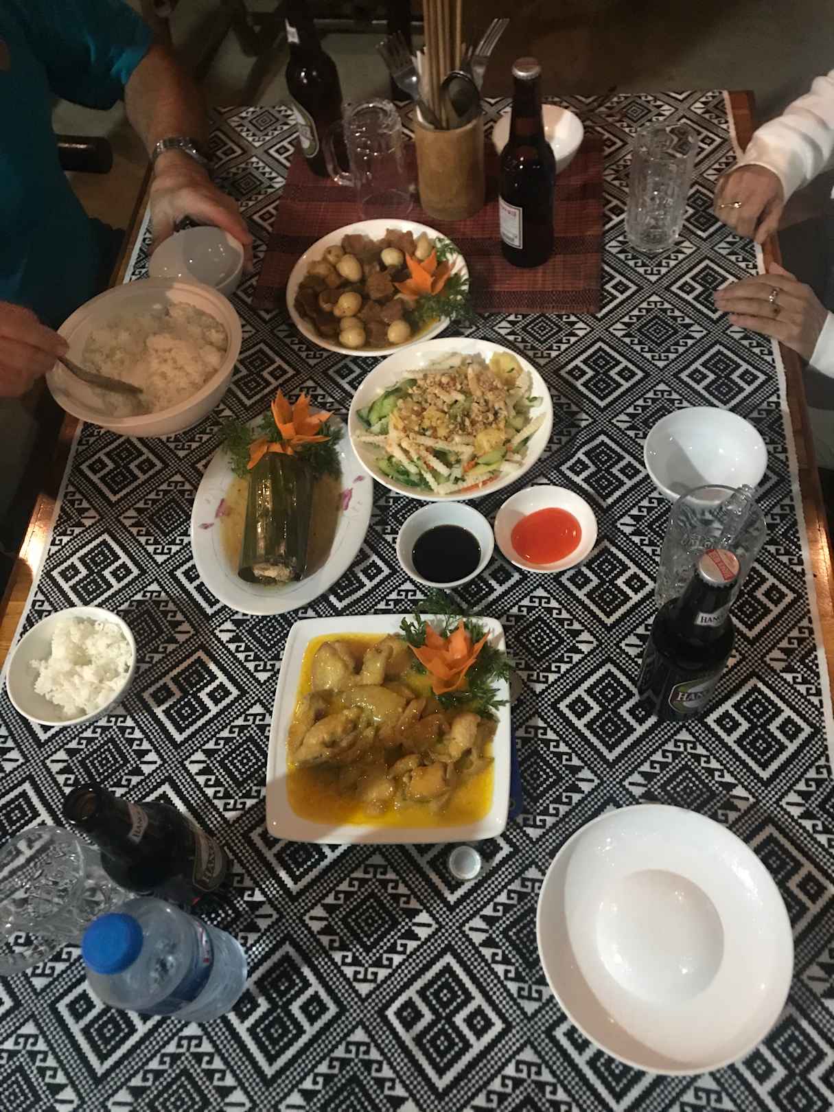 Das Abendessen. Einfach, sehr appetitlich und autentisch. Eine typische vietnamesische Mahlzeit für die Gäste. Für die Vietnamesen ist das ein Festmahl.