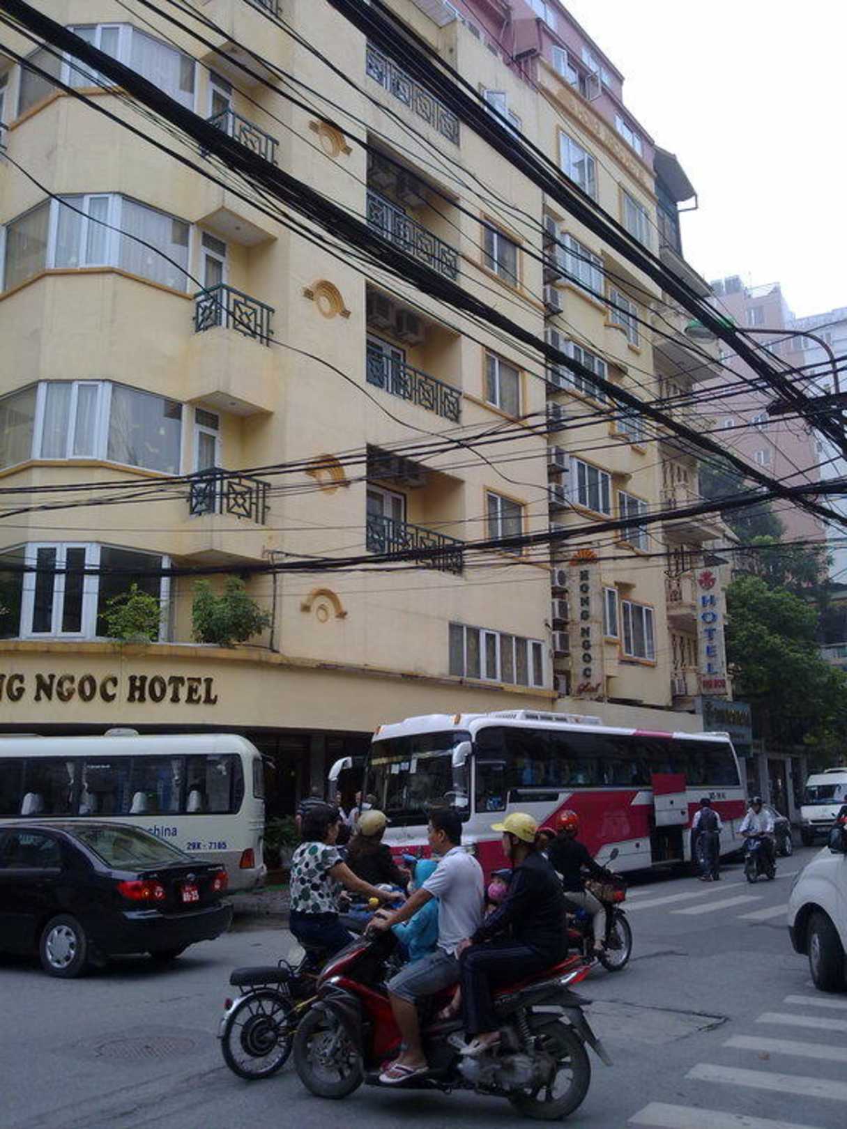 Aufnahme zeigt Hotel von gegenüberliegender Seite. Die "Ordnung" der Stromleitungen sind für vietnamesische Verhältnisse "normal"!
